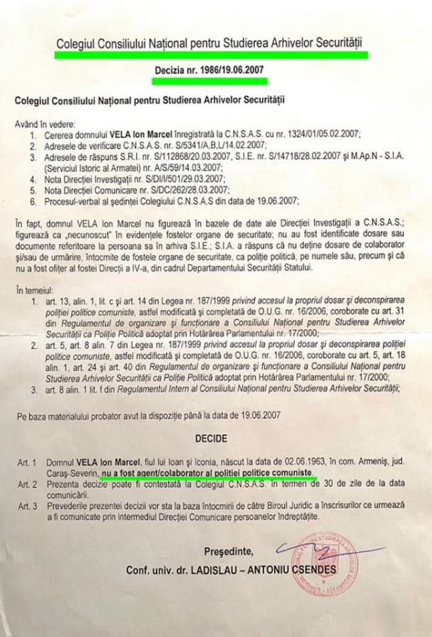 Pentru a demonta informațiile false vehiculate despre el, Vela a publicat corespondența din 2001 și Decizia CNSAS din 2007.