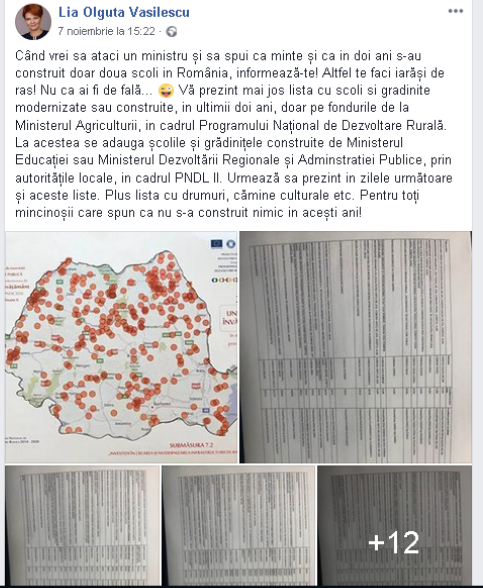 „Când vrei să ataci un ministru și să spui că minte și că în doi ani s-au construit doar două școli în România, informează-te! Altfel te faci de râs! Nu că ai fi de fală… Vă prezint mai jos lista cu școli și grădinițe modernizate sau construite, în ultimii doi ani, doar pe fondurile de la Ministerul Agriculturii, în cadrul Programului Național de Dezvoltare Rurală. (…) Pentru toți mincinoșii care spun că nu s-a construit nimic în acești ani!”, scria, pe 7 noiembrie 2018, fostul ministru.