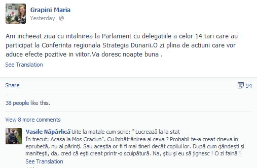 Ministrul pentru IMM, Maria Grapini, este foarte activă pe contul de Facebook, acolo unde postează zilnic mesaje pentru fani, care în general privesc programul de lucru.