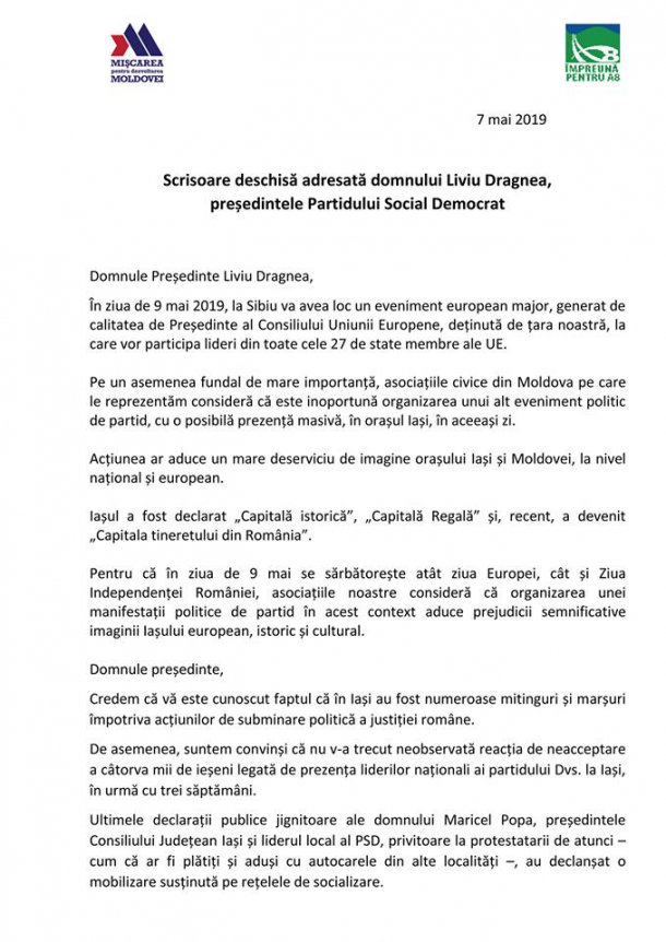 Asociațiile civice „Mișcarea pentru Dezvoltarea Moldovei” și „Împreună pentru A8” i-au trimis o scrisoare deschisă preşedintelui PSD, Liviu Dragnea, prin care îi cer anularea mitingului programat la Iaşi pentru 9 mai.