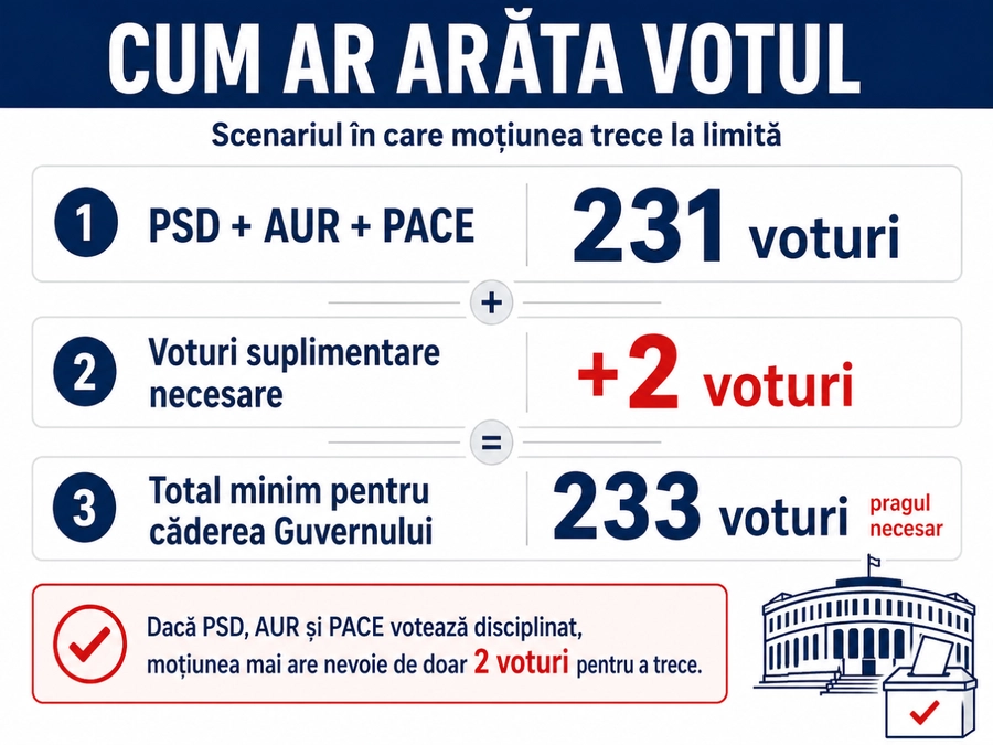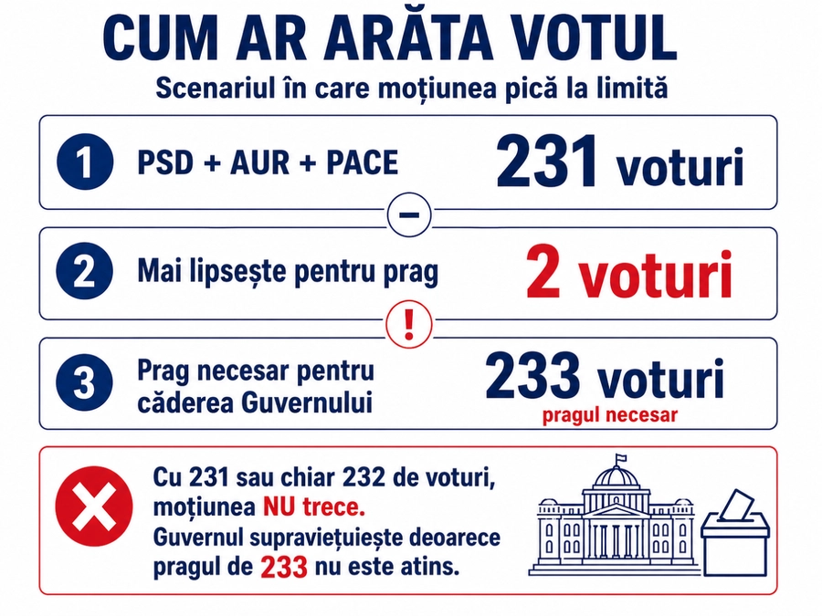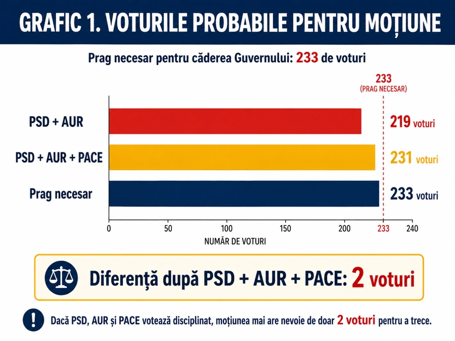 Cheia votului: dacă PSD, AUR și PACE votează disciplinat, moțiunea pleacă de la aproximativ 231 de voturi. Asta înseamnă că Guvernul poate cădea cu doar două voturi suplimentare venite de la SOS, POT, neafiliați sau eventual parlamentari din zona PNL/USR/UDMR/Minorități.