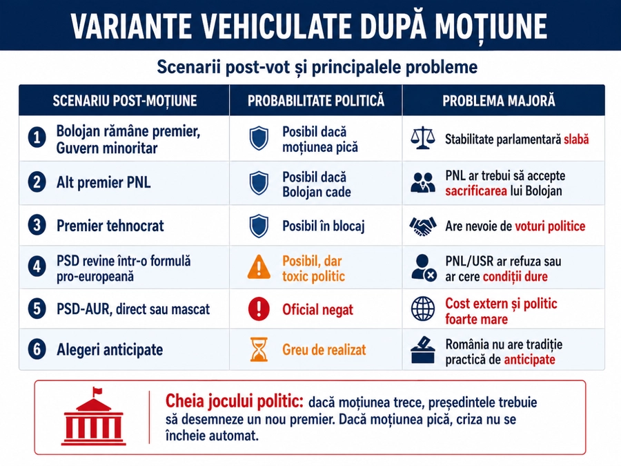 Consecința imediată: Ilie Bolojan rămâne premier interimar, iar președintele Nicușor Dan trebuie să înceapă consultările pentru desemnarea unui nou premier. Reuters notează că, dacă Guvernul cade, președintele ar încerca probabil să formeze o nouă majoritate pro-europeană, posibil cu un alt liberal sau cu un tehnocrat în fruntea Executivului.