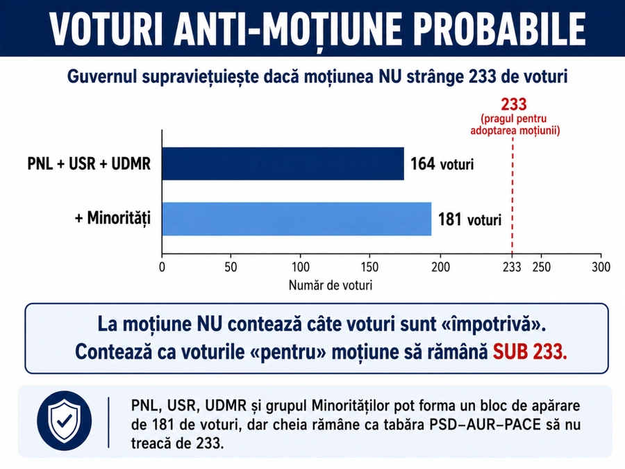 PNL, USR și UDMR au împreună aproximativ 164 de parlamentari, iar împreună cu Minoritățile ajung la 181. Asta nu este suficient pentru o majoritate pro-Guvern, dar la moțiune logica e inversă: Guvernul supraviețuiește dacă moțiunea nu strânge 233 de voturi.