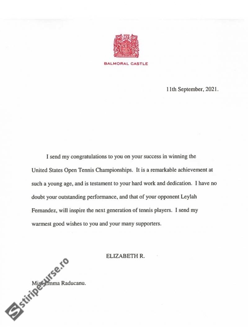 „Te felicit pentru triumful de la US Open. E o realizare remarcabilă la o vârstă atât de tânără şi e dovada muncii tale extraordinare şi a dedicării. N-am nicio îndoială că performanţa ta ieşită din comun, alături de cea a adversarei, Leylah Fernandez, va inspira următoarea generaţie a jucătorilor de tenis. Îţi trimit cele mai calde urări, ţie şi mulţilor tăi fani. Elizabeth R.”, i-a transmis Regina sportivei cu origini românești.