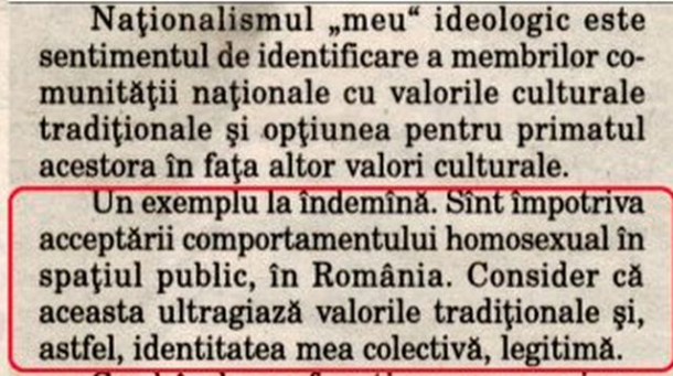 “În primul rând, e un articol scris în anul 2.000, deci acum 12 ani. În al doilea rând, articolul nu era împotriva homosexualităţii, ci era o opinie între majoritate şi minoritate în spaţiul public, identică cu chestiunea icoanelor în şcoli. Mi-am schimbat însă între timp această opinie şi sunt deschis faţă de toate minorităţile”, a spus președintele Asociației Salvați Bucureștiul după 12 ani în care, probabil, și-a dat seama că toată lumea iese la vot, înclusiv minoritățile sexuale.