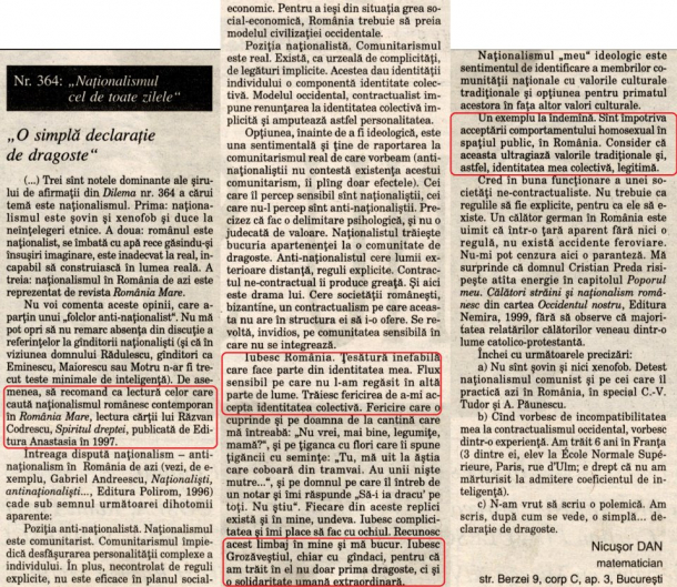 Amintim în acest context o declarație a lui Nicușor Dan, președintele Asociației Salvați Bucureștiul, din anul 2000. Acesta a scris într-un articol publicat de săptămânalul Dilema că este împotriva minorităților sexuale .