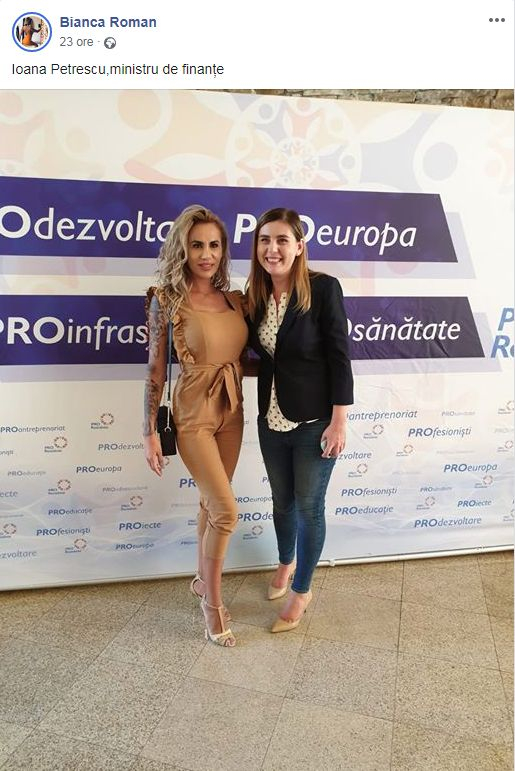 Într-una dintre fotografiile de pe Facebook, Bianca apare alături de Ioana Petrescu, vicepreşedinte al Pro România și fost ministru al Finanțelor în guvernul Ponta.