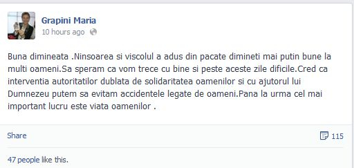 „Bună dimineaţa. Ninsoarea şi vântul a adus din păcate dimineţi mai puţin bune la mulţi oameni. Să sperăm că vom trece cu bine şi peste aceste zile dificile. Cred că intervenţia autorităţilor dublată de solidaritatea oamenilor şi cu ajutorul lui Dumnezeu putem să evităm accidentele legate de oameni. Până la urmă cel mai important lucru este viaţa oamenilor”, a scris Grapini.