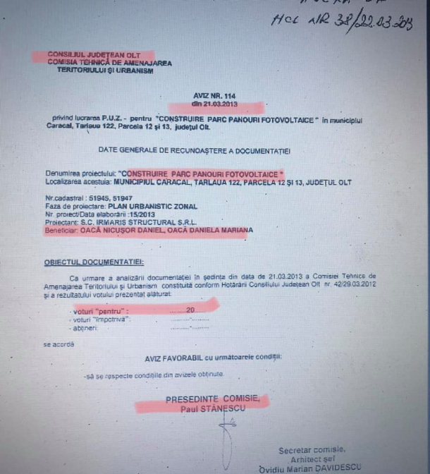 Este vorba despre un aviz dat pe data de 21 martie 2013 de Comisia de Amenajarea Teritoriului și Urbanism, condusă chiar de către fostul președinte al CJ Olt, Paul Stănescu, pentru construirea unui parc cu panouri fotovoltaice întins pe 17 hectare, la Caracal. Beneficiarul direct este Nicușor Oacă, unul dintre șefii clanurilor interlope din oraș.