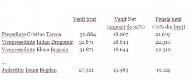 Așadar, veniturile brute ajung în cazul înalților magistrați ai ÎCCJ la 31.871 de lei, în cazul celor doi videpreședinți Iulian Dragomir și Elena Bogasiu. Venitul brut al președintei ÎCCJ Cristina Tarcea este mai mic decât al celor doi vicepreședinți. Diferența o fac titlurile de doctor, care le aduc în plus 950 de lei pe lună.