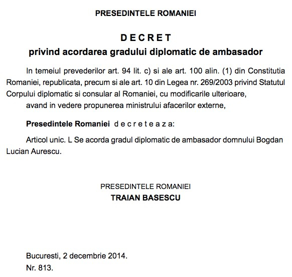 “Marți, 2 decembrie 2014, ministrul Afacerilor Externe, Bogdan Aurescu, i-a propus președintelui Traian Băsescu să-i acorde lui Bogdan Aurescu gradul diplomatic de ambasador. Președintele Traian Băsescu a fost de acord și a semnat decretul 813 din 2014.
