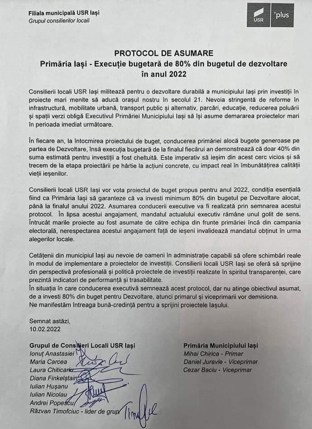 „Semnarea se va realiza cu condiția ca USR Iași să voteze și să sprijine pe parcursul întregului an demersurile necesare implementării bugetului propus de executiv și adoptat pentru anul 2022. Executivul Primăriei Iași nu va răspunde pentru sincopele care nu-i sunt imputabile fiind cauzate de factori externi, necontrolabili.