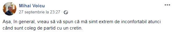 “Așa, în general, vreau să vă spun că mă simt extrem de inconfortabil atunci când sunt coleg de partid cu un cretin”, s-a plâns Mihai Voicu, pe Facebook.