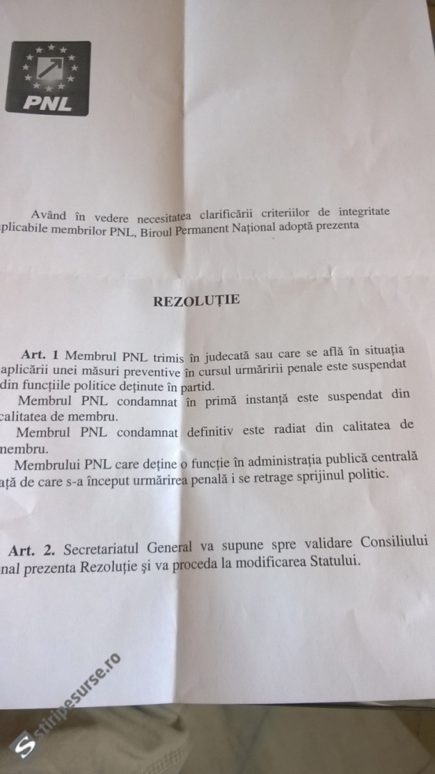 Astfel, se arată în rezoluție, „membrul PNL trimis în judecată sau care se află în situația aplicării unei măsuri preventive în cursul urmăririi penale este suspendat din funcțiile politice pe care le deține în partid”.
