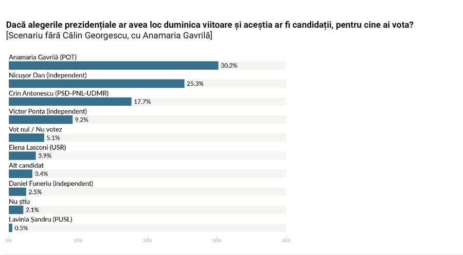În scenariul în care Anamaria Gavrilă ar fi candidata unică a suveraniștilor, 80.5% dintre votanții lui Călin Georgescu ar merge către aceasta, 6.4% către Victor Ponta, iar restul spre alți candidați sau nu votează.