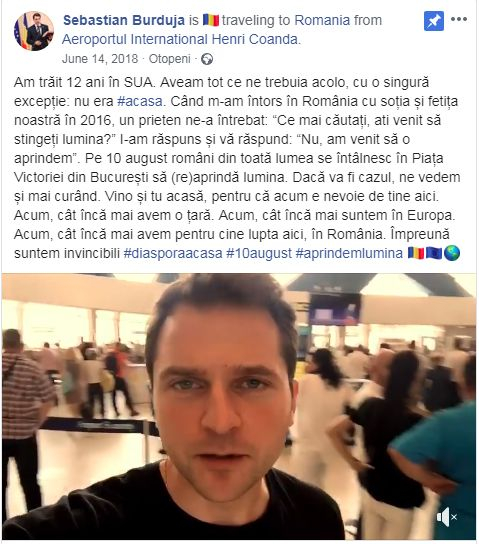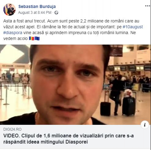 În schimb, un apel public pentru o manifestaţie de mare amploare a fost făcut de către Sebastian Burduja, unul dintre iniţiatorii mitingului diasporei din 10 august 2018 şi actual preşedinte interimar al PNL Sector 1. Acesta a arătat că îndemnul de anul trecut a ajuns să fie văzut de un număr foarte mare de oameni şi îi cheamă pe toţi aceştia să vină şi anul acesta în Piaţa Victoriei pentru a îşi manifesta nemulţumirea faţă de felul în care este condusă România.