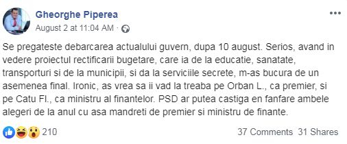 „Se pregateste debarcarea actualului guvern, dupa 10 august. Serios, avand in vedere proiectul rectificarii bugetare, care ia de la educatie, sanatate, transporturi si de la municipii, si da la serviciile secrete, m-as bucura de un asemenea final. Ironic, as vrea sa ii vad la treaba pe Orban L., ca premier, si pe Catu Fl., ca ministru al finantelor. PSD ar putea castiga en fanfare ambele alegeri de la anul cu asa mandreti de premier si ministru de finante”, arăta avocatul Gheorghe Piperea.