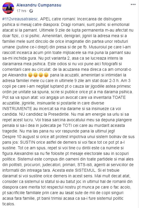 „APEL: Dragi oameni buni, CER jegurilor care au tinut cu procurorii care au omorat-o sa nu aiba cinismul de a cere tocmai EI sa iasa lumea in strada. Sa lase jocurile electorale si politica departe de Alexandra. Cand vom considera ca nu mai este nici o speranta, familia Alexandrei va va ruga sa aprindeti o lumanare pt ea in liniste intr-un loc nepolitizat din Bucuresti si atat. Fara lozinici si manipulari.”, a scris Cumpănașu pe Facebook.