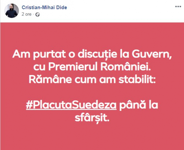 Acesta a confirmat pe Facebook întrevederea cu prrim-ministrul României. Fără a declara care a fost subiectul discuției, Dide lansează un mesaj cu subînțeles.