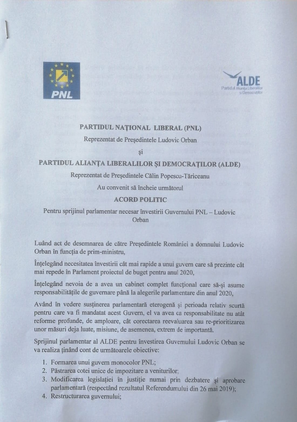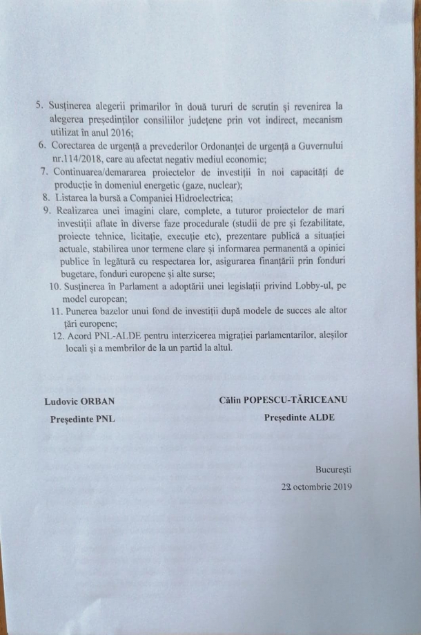 „Acordul conține 12 puncte, pe care le-am discutat și negociat cu cei din PNL. Vizează mersul înainte al României, de la economie la funcționarea instituțiilor”, a spus liderul ALDE.