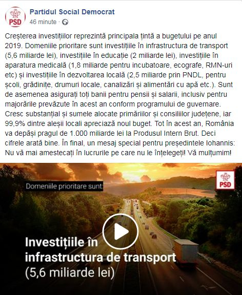 ”Un mesaj special pentru președintele Iohannis: Nu vă mai amestecați în lucrurile pe care nu le înțelegeți! Vă mulțumim!” – încheie PSD o postare în care se laudă că investițiile vor fi principala preocupare a Guvernului în acest an.