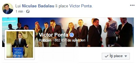 Joi, Niculae Bădălău a apreciat pagina de Facebook a lui Ponta, semn probabil că rezonează cumesajele sale.