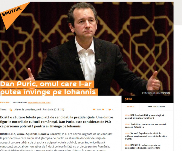 „Imediat, numele lui Mihai Gâdea a apărut ca unul dintre posibilii candidați ai PSD, informația fiind lansată public de Ion Cristoiu. Gâdea a negat orice posibilitate să accepte un asemenea rol. Și atunci s-a trecut la o altă variantă, cea a cunoscutului actor, regizor și om de cultură Dan Puric. Acesta s-a ferit până acum de politică, dar și-a consolidat celebritatea și credibilitatea în zona mesajelor suveraniste, fiind deseori atacat de presa mainstream pentru felul în care face apel la tradițiile românești și la specificitatea culturii autohtone pentru promovarea cărora a depus întotdeauna eforturi supraomenești”, deschide ideea Sputnik.