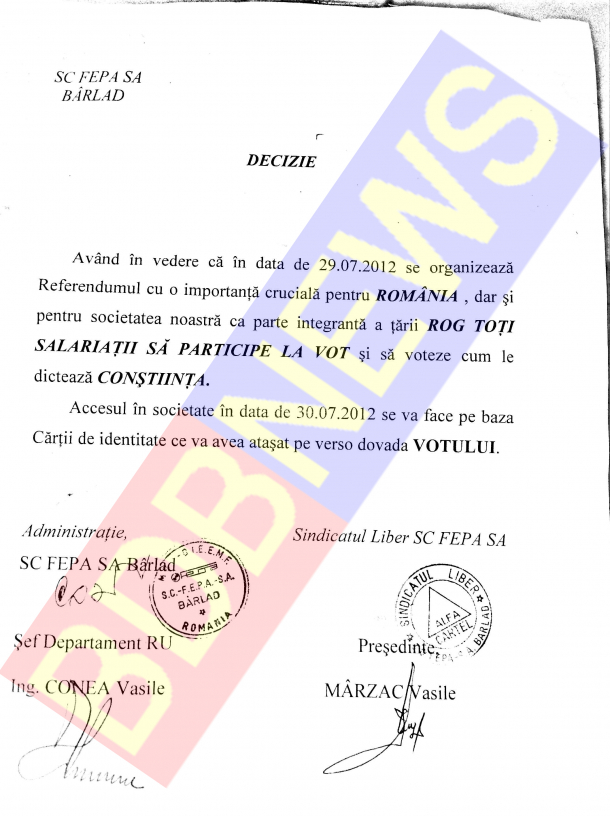 „Accesul în societate în data de 30.07.2012 se va face pe baza Cărţii de identitate ce va avea ataşat pe verso dovada VOTULUI.“, se arată în documentul transmis de conducerea fabricii către angajați.