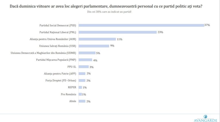 Potrivit G4media, la întebarea ”dacă duminica viitoare ar avea loc alegeri parlamentare, dumneavoastră personal cu ce partid politic ați vota?”, doar 38% au indicat un partid anume. Potrivit acestor răspunsuri, PSD ar obține 37% din voturi, PNL 23%, AUR 11% iar USR 9%. UDMR este la limita pragului electoral cu 5%. Noul partid al lui Dacian Ciolos este cotat cu 1% iar fostul premier are cea mai slabă cotă de încredere: 6%.