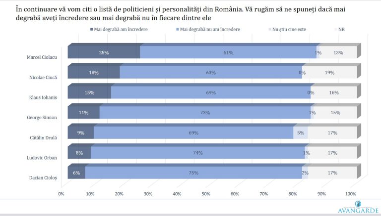 Liderul PSD Marcel Ciolacu este liderul în care românii declară că mai degrabă au încredere (25%), urmat de premierul Nicolae Ciucă (18%), președintele Klaus Iohannis (15%), George Simion (11%) și Cătălin Drulă (9%), se artă într-un sondaj realizat de Avangarde la comanda PSD.