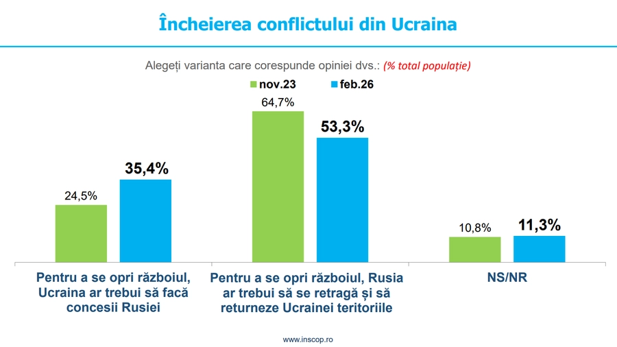 Potrivit unui sondaj realizat de INSCOP, deși majoritatea de 53,3% consideră în continuare că Rusia ar trebui să se retragă și să returneze teritoriile, cifra este într-o scădere vizibilă față de pragul de 64,7% înregistrat la finalul anului 2023.