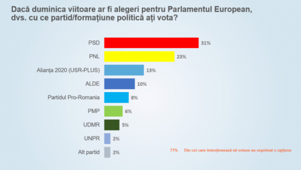 Cel mai nou sondaj de opinie de la CURS privind alegerile europarlamentare plasează PSD pe primul loc cu 31% din intenţiile de vot ale românilor. Imediat pe locul 2 se clasează PNL cu 23%.