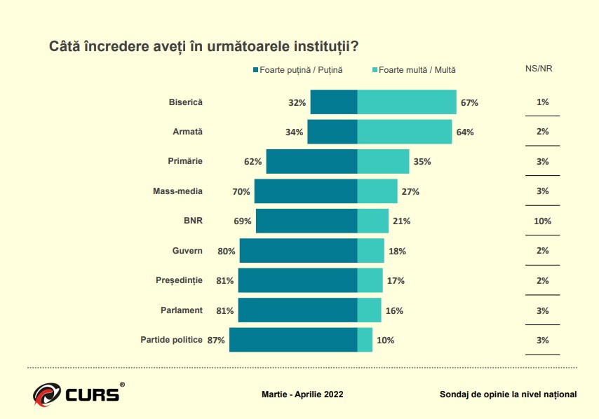 Pe de altă parte, partidele politice au obținut cel mai mic grad de încredere, în comparație cu alte instituții. Românii consideră Biserica cea mai capabilă instituție. Locul 2 este ocupat de Armată.