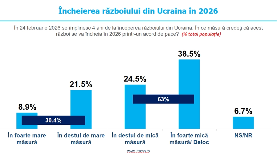 Conform sondajului ”4 ani de război în Ucraina. Impactul profund asupra opiniei publice din România”, realizat de INSCOP Research la solicitarea New Strategy Center, doar 3 din 10 români cred că războiul din țara vecină se va încheia în 2026 printr-un acord de pace.