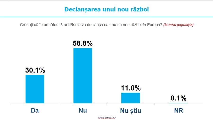 30.1% dintre respondenți cred că în următorii 3 ani Rusia va declanșa un nou război în Europa, în timp ce 58.8% sunt de părerea contrarie. 11% nu știu iar 0.1% nu răspund.