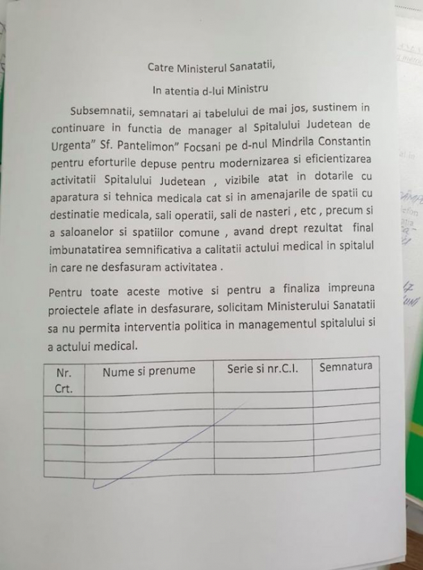 Preşedintele PNL Vrancea, senatorul Cătălin Toma, susține că managerul Spitalului Judeţean Sfântul Pantelimon din Focşani îi pune pe angajații unității medicale să semneze o petiție pentru ca el să fie menținut pe funcție.