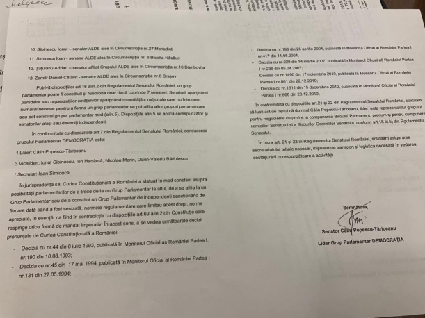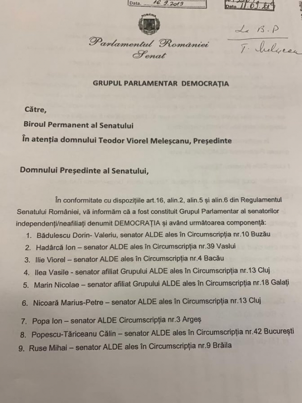 Preşedintele ALDE, Călin Popescu Tăriceanu, a înaintat către noul preşedinte al Senatului, Teodor Meleşcanu, documentele pentru înfiinţarea noului grup din Senat, alături de aleşii din Pro-România.