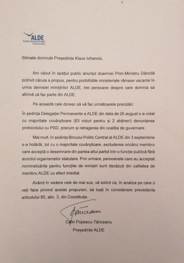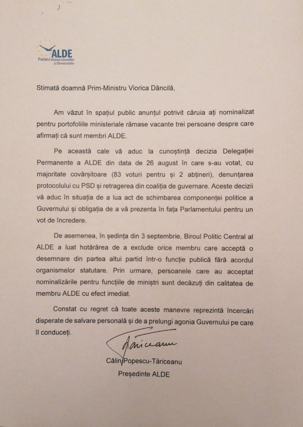 Acesta a trimis două scrisori deschise către preşedintele Klaus Iohannis şi premierul Viorica Dăncilă în care îi înştiinţează că ALDE a decis cu majoritate covârşitoare ieşirea de la guvernare, iar cei trei nu pot fi numiţi drept membri ALDE deoarece orice persoane care acceptă o poziţie publică este automat exclusă.