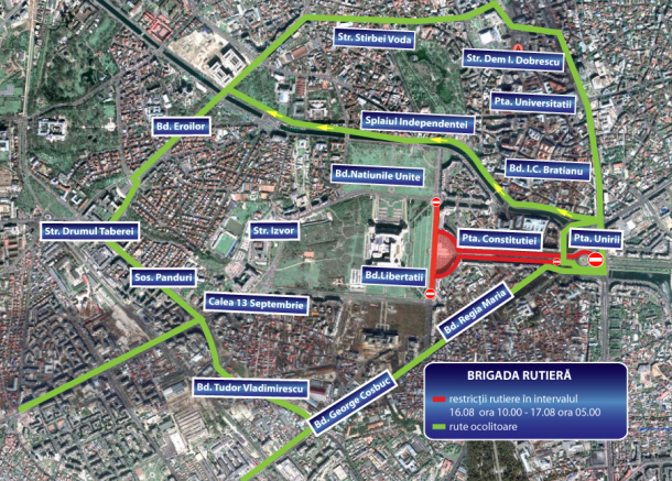 Potrivit Brigăzii Rutiere București, de joi, ora 10.00, până vineri, ora 5.00, va fi restricţionat traficul rutier pe Bd. Unirii, între Bd. I.C. Brătianu şi Piaţa Constituţiei, şi pe Bd. Libertăţii, între Calea 13 Septembrie şi Bd. Naţiunile Unite.