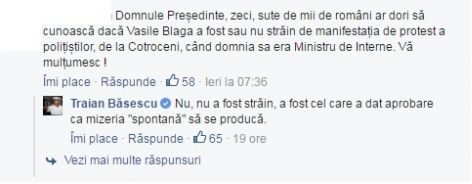 „Probabil ştiţi şi despre discuţia de la Craiova din 2007 cînd Blaga şi alţi lideri PD mă vindeau lui Tăriceanu înainte de referendumul de suspendare, dar şi despre discuţiile lui Blaga cu Hurezeanu şi alţii din Herăstrău, cînd între turul unu şi doi al prezidenţialelor din 2009 încercau să mă vîndă lui Geoană şi PSD-ului. Uitase un lucru, că Băsescu însuşi nu era de vînzare. În acest sens întrebaţi-o cîte ceva şi pe doamna Săftoiu, mare lipitoare la banii oferiţi nelimitat de Blaga“, a spus Traian Băsescu.