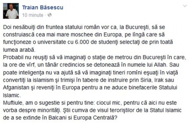 Traian Băsescu a scris joi seara un mesaj pe pagina sa de Facebook prin care condamnă construirea unei moschei la București, și cu atât mai mult a unei universități cu studenți din lumea arabă.