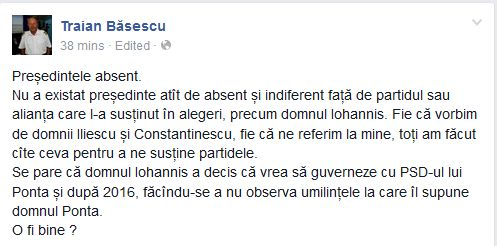 „Se pare că domnul Iohannis a decis că vrea să guverneze cu PSD-ul lui Ponta și după 2016, făcîndu-se a nu observa umilințele la care îl supune domnul Ponta. O fi bine ?”, a mai scris fostul președinte pe site-ul de socializare.