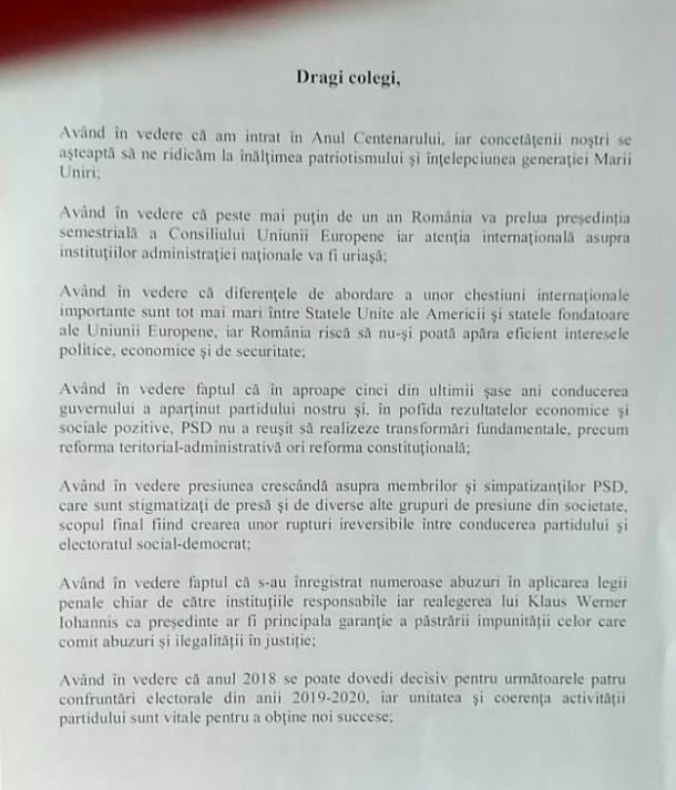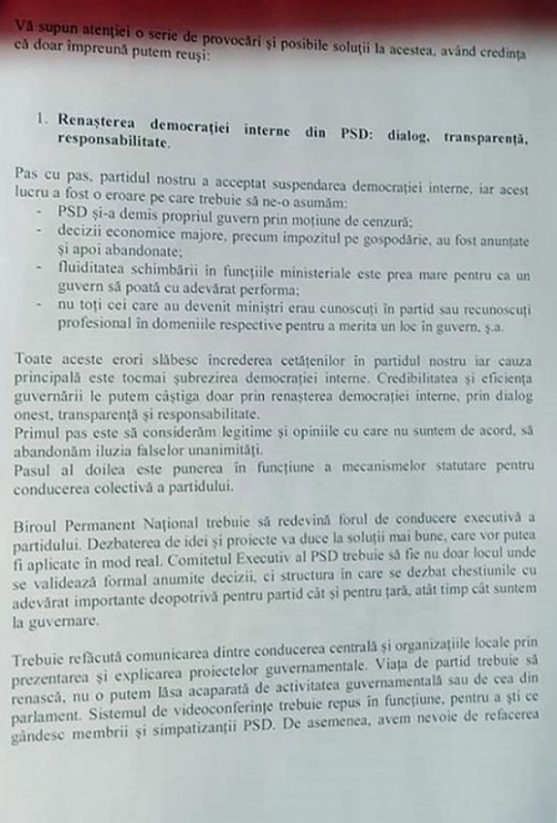 Toate acestea slăbesc încrederea cetăţenilor în partidul nostru, iar cauza principală este tocmai şubrezirea democraţiei interne”, se arată în mesajul către membrii PSD.