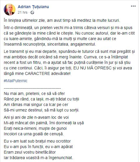Exclus din PSD la finalul lui 2018 pentru că i-a cerut demisia lui Liviu Dragnea şi s-a criticat direcţia în care merge partidul, Adrian Ţuţuianu îşi începe anul prin a dedica o poezie celor care l-au trădat.