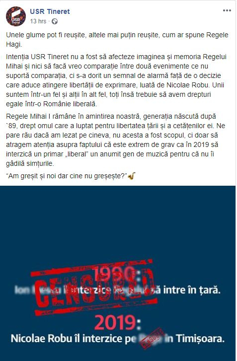 Intenția USR Tineret nu a fost să afecteze imaginea și memoria Regelui Mihai și nici să facă vreo comparație între două evenimente ce nu suportă comparația, ci s-a dorit un semnal de alarmă față de o decizie care aduce atingere libertății de exprimare, luată de Nicolae Robu. Unii suntem într-un fel și alții în alt fel, toți însă trebuie să avem drepturi egale într-o Românie liberală.