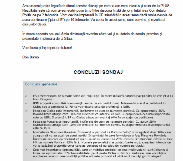 Barna ataşează scrisorii şi câteva concluzii dintr-un sondaj comandat de USR, informează stiripesurse.ro. Astfel, USR şi PLUS se luptă pentru acelaşi electorat, motiv pentru care alianţa ar fi cea mai bună variantă. Pro România este văzut ca o alternativă curată de români, însă „fură” electorat mai mult de la PSD. Klaus Iohannis şi Gabriela Firea sunt cele mai apreciate personalităţi politice, iar partidele care vor obţine susţinerea lor la europarlamentare vor avea un avantaj serios.