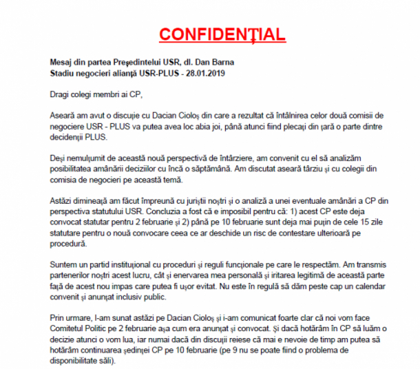 Dan Barna, președintele USR, a trimis o scrisoare membrilor Comitetului Politic al partidului, prin care se arată enervat și iritat de faptul că discuțiile cu PLUS despre alianță sunt amânate, iar decizia finală ar putea fi luată cu două săptămâni mai târziu decât a fost programat. De vină pentru amânări sunt liderii PLUS, care sunt plecați din țară în aceste zile. Barna se arată nemulțumit că, din cauza acestora, trebuie decalat un program care fusese dinainte stabilit și care fusese și comunicat public.