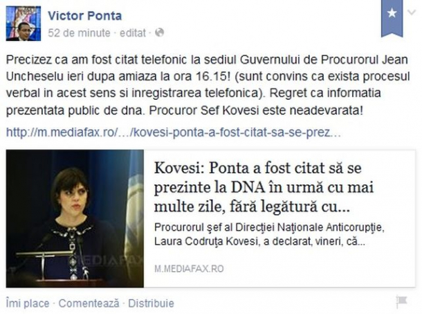 Premierul Victor Ponta a scris vineri pe contul său de facebook, că a fost citat telefonic la sediul Guvernului, subliniind că procurorul șef, Laura Codruța Kovesi a mințit când a zis că citarea s-a făcut cu mai multe zile în urmă.