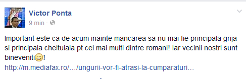 „Important este ca de acum inainte mancarea sa nu mai fie principala grija si principala cheltuiala pt cei mai multi dintre romani! Iar vecinii nostri sunt bineveniti”, a scris Ponta pe pagina de Facebook.