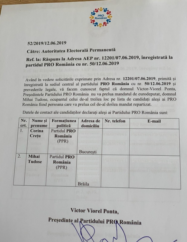 Am informat azi AEP referitor la cei doi colegi din ProRomania care vor prelua mandatele de europarlamentar.